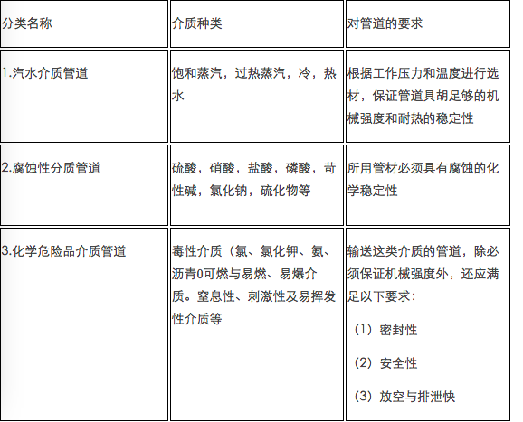 不同性質(zhì)的介質(zhì)對(duì)管道的要求不同,可參見表1-1-9。